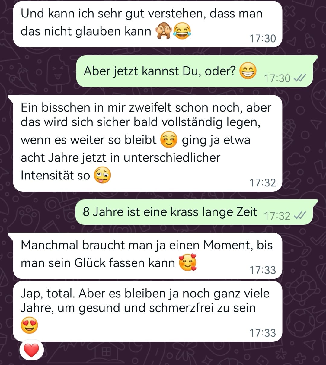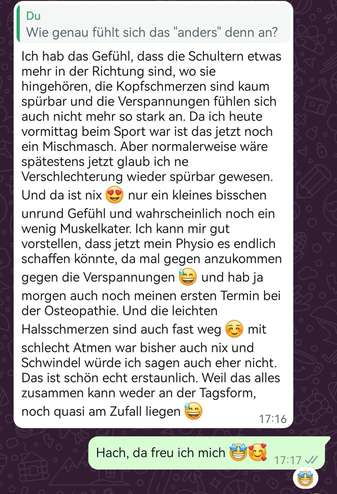 Du hast Fragen, möchtest Deinen Fortschritt teilen oder benötigst einen schnellen Impuls? Mit meiner WhatsApp-Betreuung stehe ich Dir flexibel und direkt zur Seite. Innerhalb von 24 Stunden erhältst Du Deine Antwort – individuell und genau auf Deine Situation zugeschnitten.