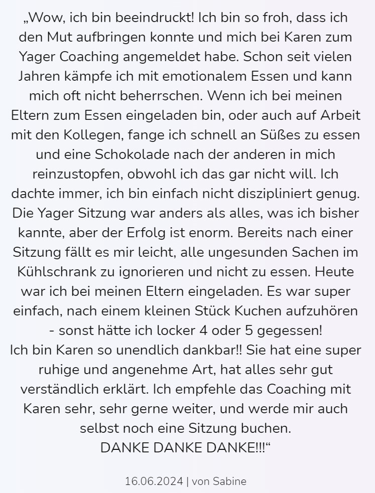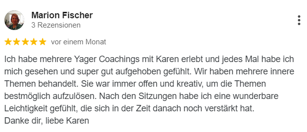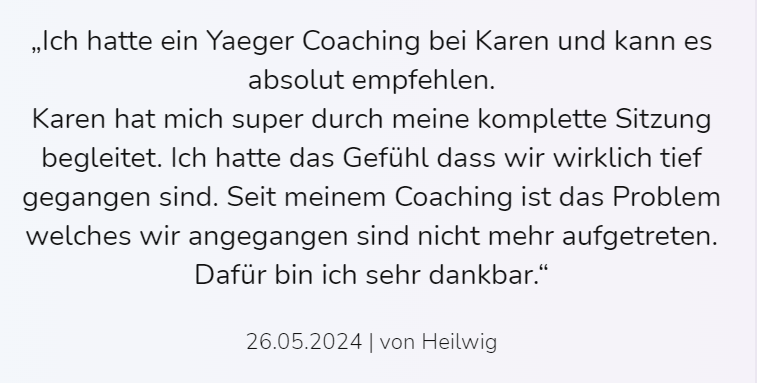 Hast Du das Gefühl, dass ein bestimmtes Thema Dich immer wieder zurückhält? Dich begleiten Ängste oder psychosomatische Schmerzen? Im Yager Coaching nehmen wir uns 90-120 Minuten Zeit, um genau daran zu arbeiten. Ein Vorgespräch und zwei Wochen Nachbetreuung über WhatsApp sorgen dafür, dass die Veränderung nachhaltig ist.